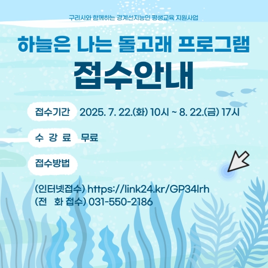 ‘즐거운 토요학교 - 하늘을 나는 돌고래’은 지난해에 이어 올해도 추진되는 것으로 초등학교 고학년 경계선지능인을 대상으로 운영된다. 운영 기간은 9월 13일부터 10월 25일까지이며, 총 6회 과정으로 운영될 예정이다. 수강생 모집은 7월 22일 오전 10시부터 구리시 홈페이지 통합예약포털에서 선착순으로 신청을 받는다.