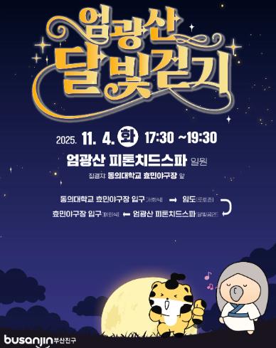 [뉴스노크=김인호 기자] 부산 부산진구는 오는 11월 4일 오후 5시 30분에 동의대학교 효민야구장 앞에서 자연환경과 음악·퍼포먼스가 어우러진 엄광산 달빛걷기 행사를 개최한다고 밝혔다.