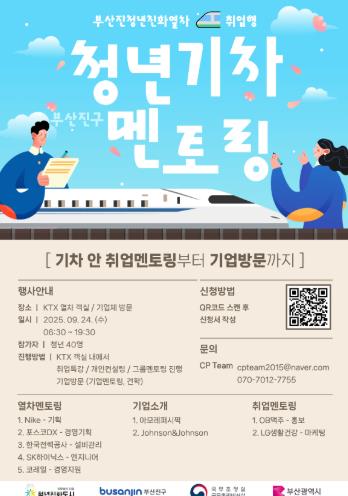 이번 '부산진청년친화열차 취업행'은 부산에서 서울까지 국토를 가로지르는 열차 안에서 40여 명의 청년들에게 글로벌 대기업, 공기업 등 10명 내외의 다양한 분야의 멘토들이 참여하여 취업특강, 개인컨설팅, 그룹멘토링 등 다양한 경험 제공과 진로 상담을 진행할 예정이다.