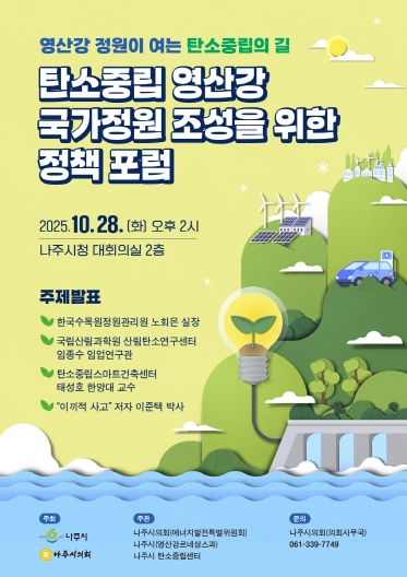 [뉴스노크=김인호 기자] 나주시의회는 나주시와 오는 28일 오후 2시, 나주시청 대회의실에서 '탄소중립 영산강 국가정원 조성을 위한 정책포럼'을 공동 개최한다고 21일 밝혔다. 이번 포럼은 탄소중립 실현을 위한 다양한 전략을 모색하고, 향후 영산강 국가정원 지정의 구체적 방향을 논의하기 위해 마련됐다.