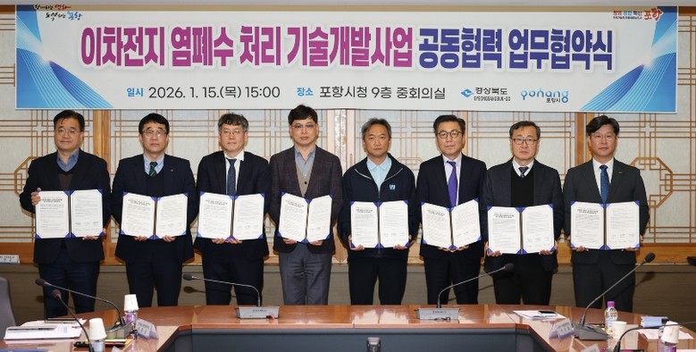 [뉴스노크=김인호 기자] 경상북도는 15일 포항시청 중회의실에서 이차전지 산업의 난제로 꼽히는 염폐수 처리 기술개발을 위한 업무협약(MOU)을 체결했다.