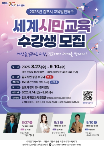 [뉴스노크=김인호 기자] 김포시는 2025년 김포시 교육발전특구 사업의 일환으로, 시민의식 함양과 글로벌 역량강화를 위한 ‘세계시민교육’을 오는 8월 27일부터 9월 10일까지 운영한다고 밝혔다.