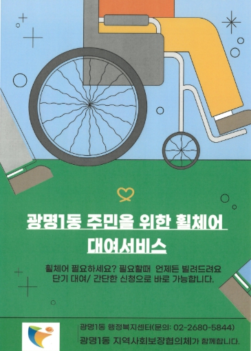 휠체어 대여를 희망하는 주민은 광명1동 행정복지센터로 문의해 신청할 수 있다. 기본 대여 기간은 1주일이며, 이용자 사정과 대기 상황에 따라 탄력적으로 조정할 수 있다.
