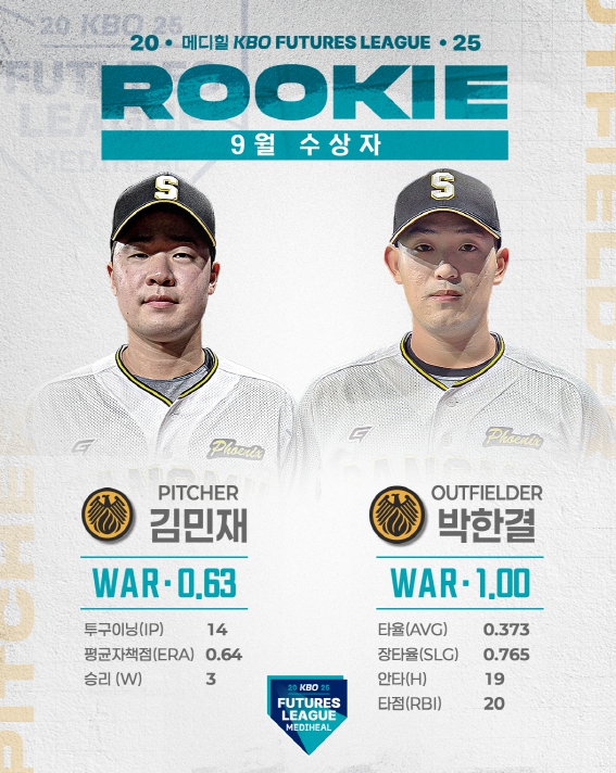 [뉴스노크=김인호 기자] 2025 메디힐 KBO 퓨처스리그의 9월 퓨처스 루키상 수상자로 투수 부문에는 상무 김민재가 WAR 0.63, 타자 부문에는 상무 박한결이 WAR 1.00을 기록하며 각각 선정됐다.