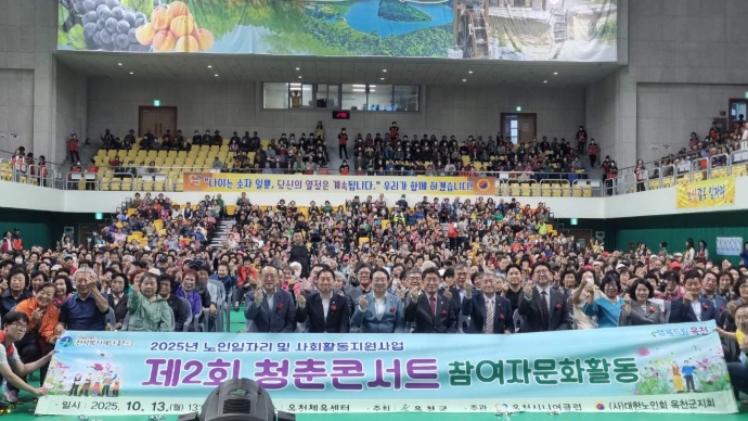 [뉴스노크=김인호 기자] 옥천군이 노인 일자리 및 사회활동 지원사업에 참여 중인 어르신들을 위한 문화행사 ‘제2회 청춘콘서트’를 13일 옥천체육센터에서 2,000여 명의 참여자를 대상으로 성황리에 개최했다.