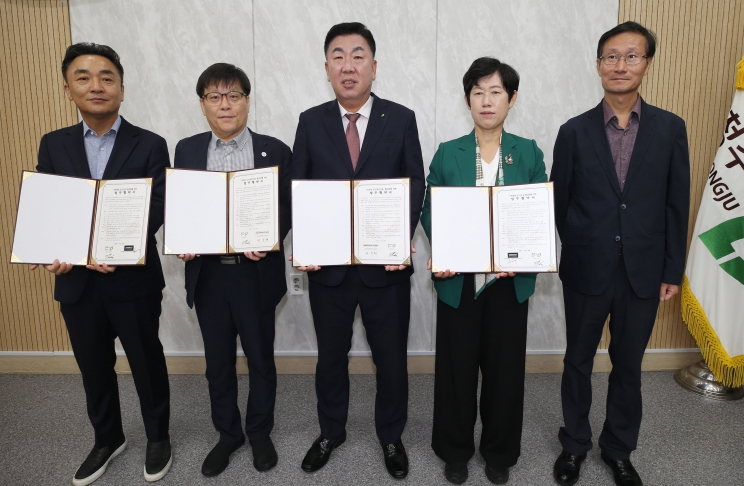 ▲ 왼쪽부터 장필규 현대백화점 아울렛커넥트사업부 사업부장, 반주현 충북RISE센터 센터장, 이범석 청주시장, 이현숙 관광과장, 김연웅 도시재생과장 |