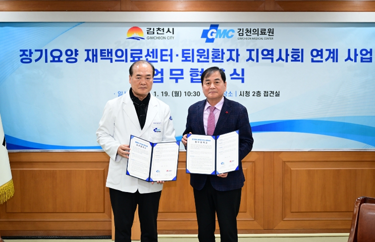[뉴스노크=김인호 기자] 김천시는 1월 19일 김천의료원과 함께 ‘장기요양 재택의료센터 시범사업’과 ‘퇴원환자 지역사회 연계 사업’ 추진을 위한 업무협약을 체결했다.