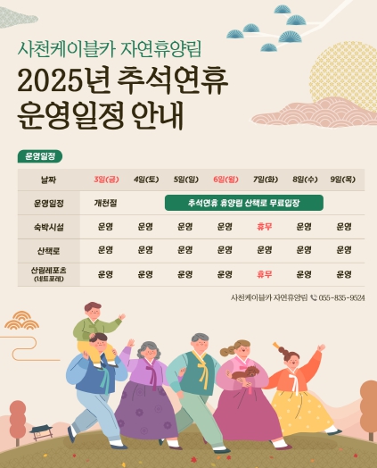 [뉴스노크=김인호 기자] 사천시는 다가오는 2025년 추석 연휴 기간 동안 ‘사천케이블카 자연휴양림’을 정상 운영한다고 22일 밝혔다.