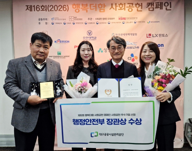 [뉴스노크=김인호 기자] 대구공공시설관리공단이 지난 2월 26일 (사)한국언론인협회와 (사)한국경영자총협회가 공동 주최하는 ‘2026 행복더함 사회공헌 캠페인’에서 우수기업으로 선정되어 행정안전부 장관상을 수상했다.