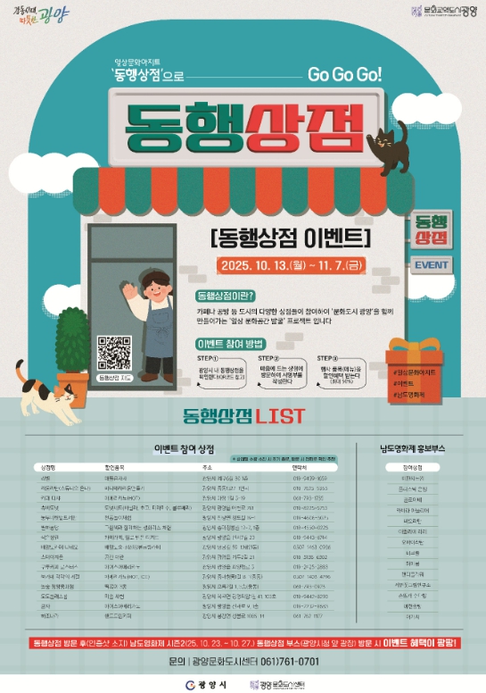 또한 10월 24일부터 26일까지 ‘남도영화제 시즌2’가 열리는 광양시청 앞 시민광장에서는 동행상점 홍보부스가 운영된다. 이 기간 14개소의 동행상점이 참여해 부스 방문객을 대상으로 SNS 이벤트를 실시하고, 다양한 물품을 증정하는 한편 홍보 리플렛도 배포할 예정이다.