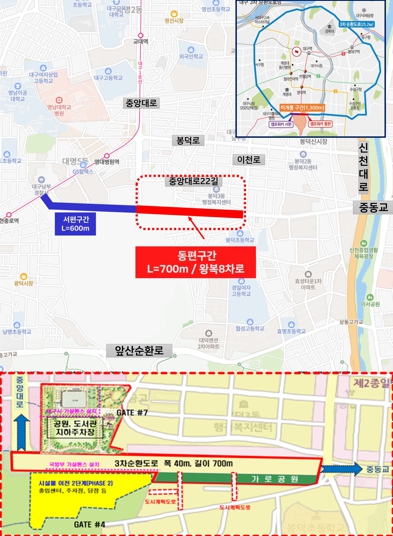 이번 동편구간 개통으로 단절된 구간이 연결되면서 도심 순환교통망이 강화되고, 중앙대로·신천대로 등 주요 간선도로와의 접근성이 크게 향상된다. 특히 캠프워커 주변 봉덕로·이천로·중앙대로22길의 일 교통량 중 평균 42%(일 24,000대)가 신규 도로로 분산돼 교통 흐름이 크게 개선될 전망이다.