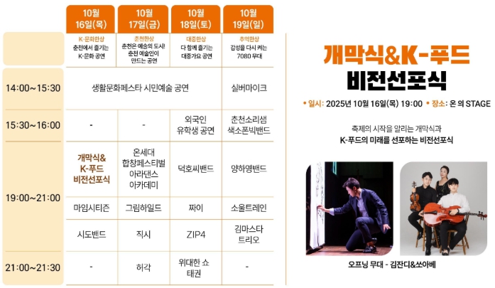 개막식은 16일 오후 7시에 열리는 가운데 개막식에서는 춘천시의 ‘K-푸드 비전선포식’이 진행돼 춘천의 막국수와 닭갈비의 세계화를 알릴 예정이다.