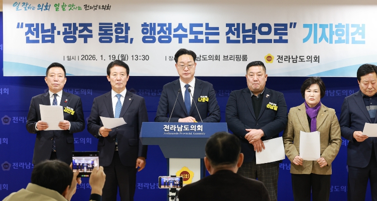 [뉴스노크=김인호 기자] 나광국(더불어민주당·무안2)은 1월 19일 13시 30분 전남도의회 브리핑룸에서 기자회견을 열고, “향후 출범할 통합 지자체의 행정청사와 자치단체장의 근무지는 반드시 현재 전남도청이어야 한다”고 강력히 주장했다.