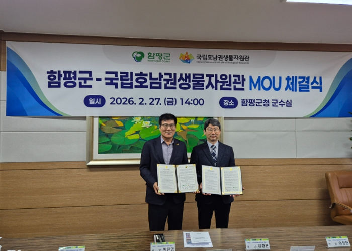 [뉴스노크=김인호 기자] 국립호남권생물자원관과 함평군은 2월 27일, 섬·연안 생물자원의 보전 가치 확산과 전시·교육 활성화를 위해 업무협약(MOU)을 체결했다.