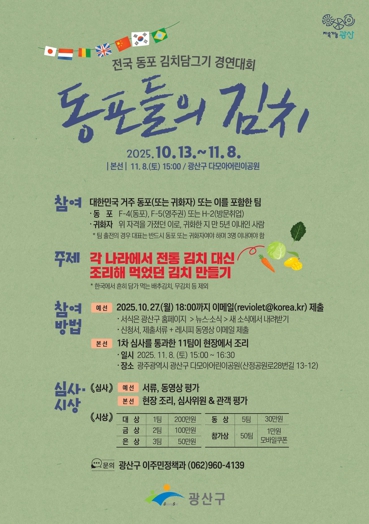 [뉴스노크=김인호 기자] 광주 광산구가 13일부터 11월 18일까지 전국 곳곳에 거주하고 있는 동포들을 대상으로 ‘전국 동포 김치담그기 경연대회_동포들의 김치’를 개최한다.