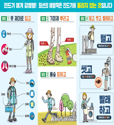 진드기 매개 감염병 예방을 위한 예방수칙으로는 ▲야외활동 시 긴팔·긴바지 입기 ▲의복과 피부에 진드기 기피제 사용 ▲풀숲·풀밭 피하기 및 앉거나 옷을 벗어두지 않기 ▲야외활동 후 샤워 및 입은 옷은 털어 세탁하기 ▲물린 흔적이나 의심증상 살피기 등이 있다.