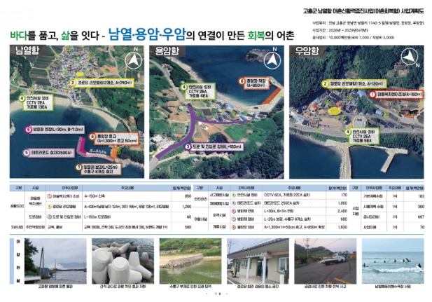 주요 사업으로는 방파제 연장 및 보강, 물양장 확장 및 증고, 도로 및 진입로 정비, 마을복지센터 조성 등이며, 어촌의 생활 인프라 확충과 안전성 강화를 위한 사업이 추진될 예정이다.
