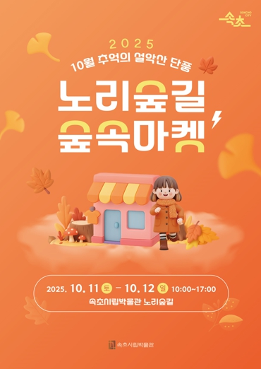 [뉴스노크=김인호 기자] 속초시립박물관이 2025년 10월 11일부터 12일까지 오전 10시부터 오후 5시까지 박물관과 노리숲길 일원에서 ‘2025년 10월 노리숲길 숲속마켓’을 연다. 입장료는 무료다.