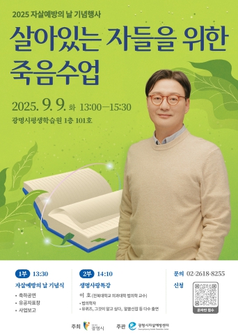[뉴스노크=김인호 기자] 광명시 자살예방센터는 오는 9일 광명시평생학습원에서 ‘2025년 자살예방의 날’을 맞아 ‘살아있는 자들을 위한 죽음수업’ 특강을 연다.