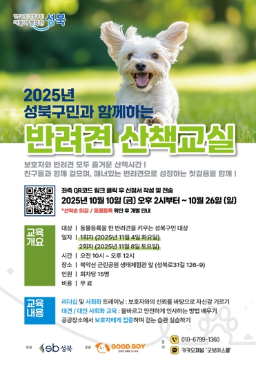 [뉴스노크=김인호 기자] 서울시 성북구가 11월 4일과 8일 전문가와 함께하는 체험형 반려견 산책교육을 실시한다. 이번 교육은 성북구민과 반려견이 함께 참여해 산책 습관과 사회화 훈련을 배우는 프로그램이다.
