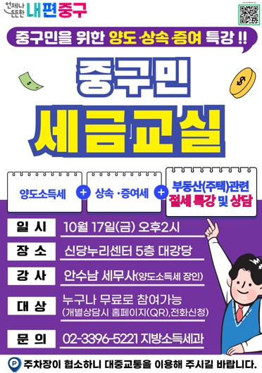 [뉴스노크=김인호 기자] 서울 중구가 어렵게만 느껴지는 세금에 대한 이해를 돕기 위해 오는 17일 오후 2시 신당누리센터 5층 대강당에서 '중구민 세금교실' 특강을 연다.