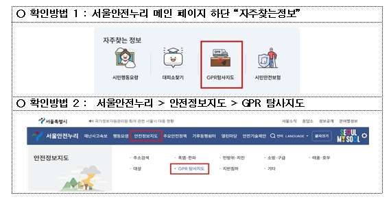 | ▲ 서울안전누리 내‘GPR 탐사지도’메뉴 확인 방법 |