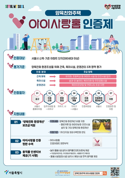 ‘양육친화주택 아이사랑홈 인증제’는 어린이집, 유치원 같은 아이들을 위한 시설이 도보권 내에 있고, 단지 안에 CCTV 같은 안전시설과 육아지원시설 등 양육친화적인 주거환경을 갖춘 민간 아파트를 서울시가 인증하는 내용이다. 신축 예정지를 포함한 서울시 내 300세대 이상 민간 아파트 단지가 대상이다.