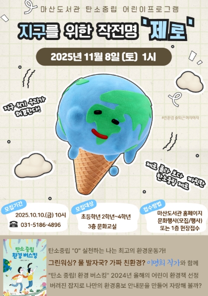 [뉴스노크=김인호 기자] 김포시 마산도서관에서 오는 11월 8일 오후 1시부터 3시까지, 초등학교 2학년~4학년 어린이를 대상으로 탄소중립 어린이 프로그램 책풍당당 '지구를 위한 작전명 ‘제로’'를 운영한다.