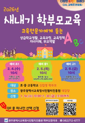 [뉴스노크=김인호 기자] 광주시교육청시민협치진흥원은 오는 2월 4~6일 본원 대강당에서 초·중·고등학교 신입생 학부모를 대상으로 ‘2026년 새내기 학부모교육’을 운영한다.