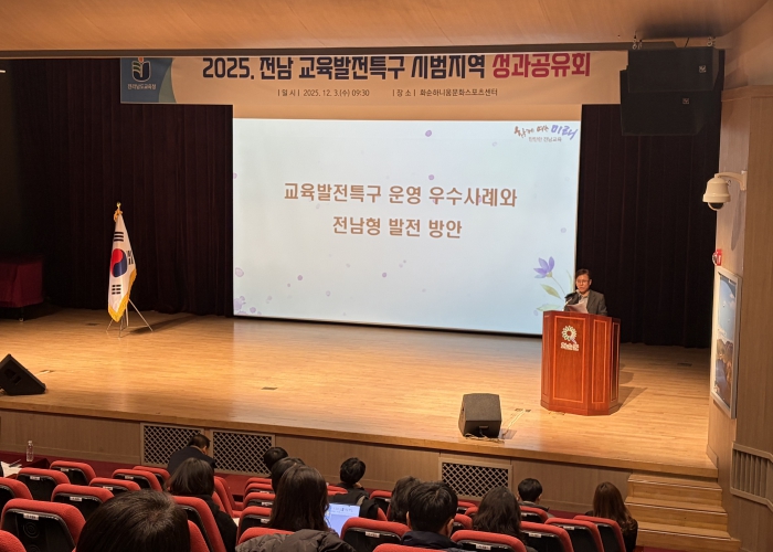 [뉴스노크=김인호 기자] 전라남도교육청이 12월 3일 화순하니움문화스포츠센터에서 ‘2025. 교육발전특구 시범지역 교육청-지자체 합동 성과공유회’를 열어 교육발전특구 사업 추진 경과를 돌아보고, 2027년 교육발전특구 정식 지정을 위한 향후 과제를 논의했다.