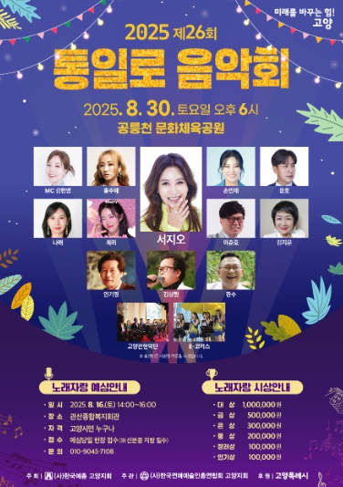 [뉴스노크=김인호 기자] 고양특례시가 후원하고 (사)한국연예예술인협회 고양지회가 주관하는 ‘2025 제26회 통일로 음악회’시민 노래자랑 예심이 오는 8월 16일 오후 2시부터 4시까지 관산동종합복지회관(덕양구 통일로 742번길28)에서 열린다.