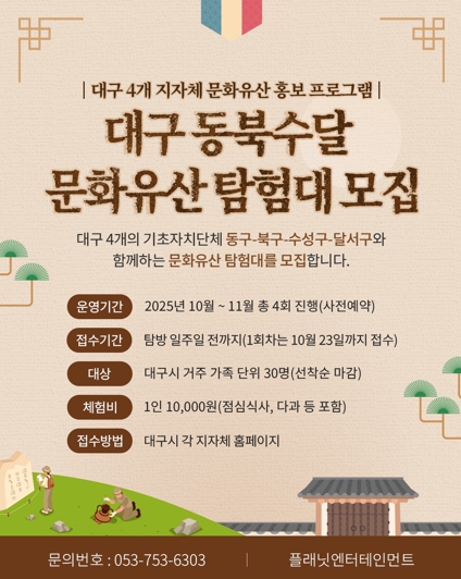 [뉴스노크=김인호 기자] 대구 수성구, 동구, 북구, 달서구가 협력해 지역의 역사와 문화를 함께 배우고 체험하는 ‘대구 문화유산 탐험대’ 운영을 시작한다.
