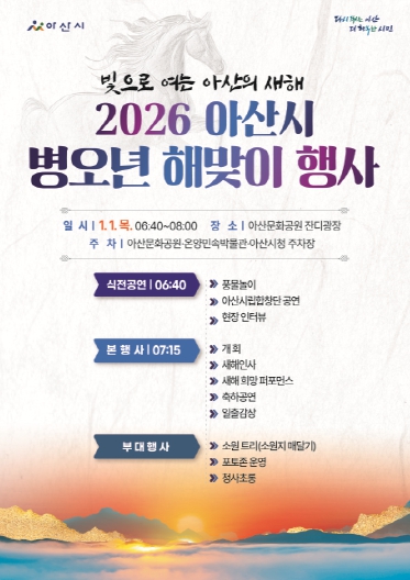 [뉴스노크=김인호 기자] 아산시는 2026년 병오년(丙午年) 새해를 맞아 오는 1월 1일 오전 6시 40분부터 8시까지 아산문화공원 잔디광장에서 ‘2026 병오년 해맞이 행사’를 개최한다.