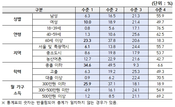 전체 대비 ‘수준 1’ 인구 비율은 남성보다는 여성에서, 연령이 높을수록, 도시보다는 농산어촌에서, 학력이나 소득이 낮을수록 상대적으로 높은 것으로 나타났다.
