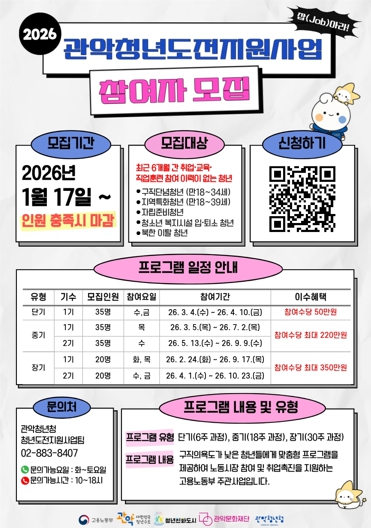 [뉴스노크=김인호 기자] 관악구가 구직을 단념한 청년들의 사회 진입을 돕기 위해 오는 1월 17일부터 ‘2026년 청년도전지원사업’ 참여자를 모집한다.