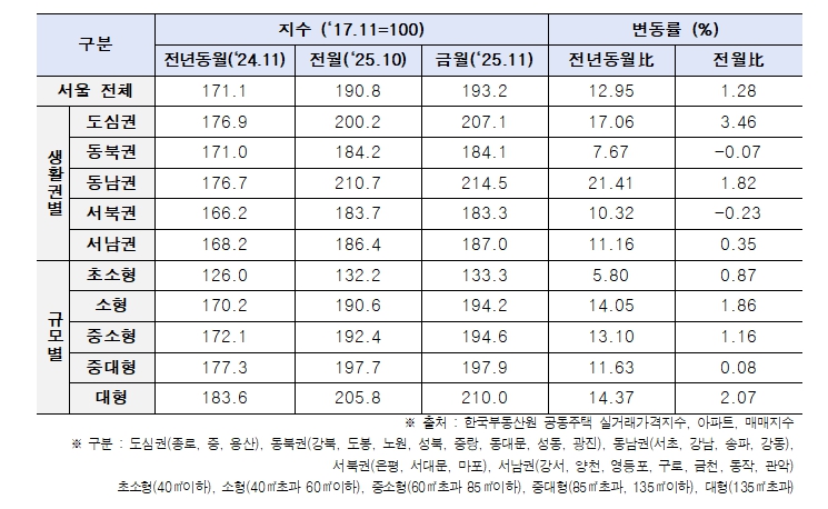 이번 달 공개된 11월 서울 아파트 매매 실거래가격은 전월(2025년 10월) 대비 1.28% 상승했으며, 전년 동월(2024년 11월)과 비교하면 12.95%의 높은 상승폭을 기록했다.