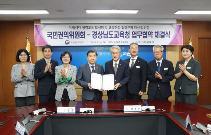 [뉴스노크=김인호 기자] 경상남도교육청은 14일 본청 중회의실에서 국민권익위원회와 함께 청렴 인재 양성과 교육 현장의 청렴문화 확산을 위한 업무 협약을 체결했다.