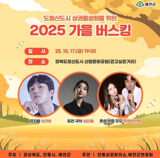 [뉴스노크=김인호 기자] 예천군은 17일 오후 7시, 도청신도시 걷고싶은거리에서 ‘가을 버스킹’ 공연을 개최하여 지역 주민들에게 가을밤의 낭만을 선사한다.