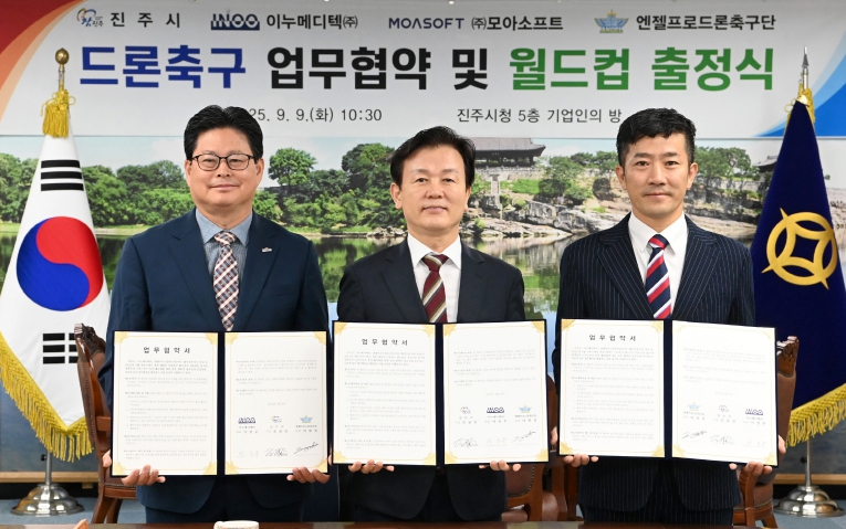 [뉴스노크=김인호 기자] 진주시는 9일 오전 10시30분 시청 5층 기업인의 방에서 이누메디텍㈜, 엔젤드론축구단과 함께 드론축구 활성화를 위한 3자 업무협약(MOU)를 체결하고 ‘2025 전주 드론축구 월드컵’에 참가하는 엔젤드론축구단의 출정식을 가졌다.
