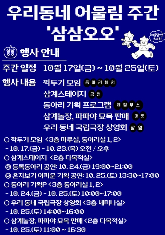 ‘삼계스테이지’는 무대 공연 프로그램으로 24일 저녁 ‘등록동아리 공연’과 25일 오후 ‘혼자 보기 아까운 기획 공연’이 운영된다. 통기타, 아코디언, 해금, 훌라댄스 등 다양한 무대 공연이 준비되어 있다. ‘삼계놀장’은 25일 오전과 오후 열리는 플리마켓으로 어울림 등록 동아리와 시민이 참여해 악세사리·가방·의류 등 직접 만든 수공예품과 중고 물품을 판매한다. ‘파파야 묘목 판매’는 어울림 주간 사전 프로그램으로 진행한 ‘못버려서 생긴 일 – 파파야 키우기’ 참가자들이 9월 한 달간 파파야 묘목을 재배해 판매하는 자리이다. 무용극 ‘호동’은 25일 오후 국립극장의 우수한 콘텐츠를 상영하는 행사이다.