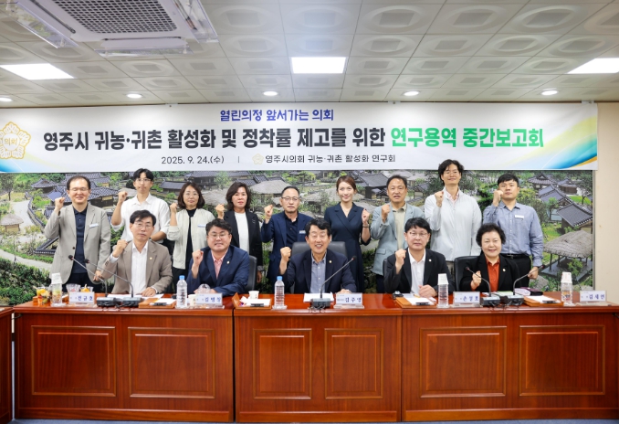 [뉴스노크=김인호 기자] 영주시의회 의원연구단체인‘귀농·귀촌 활성화 및 정착률 제고를 위한 방안 연구회’(대표의원 김주영)는 9월 24일 영주시의회 소회의실에서 연구용역 중간보고회를 열고, 귀농·귀촌인의 안정적 정착을 위한 정책 대안을 모색했다.