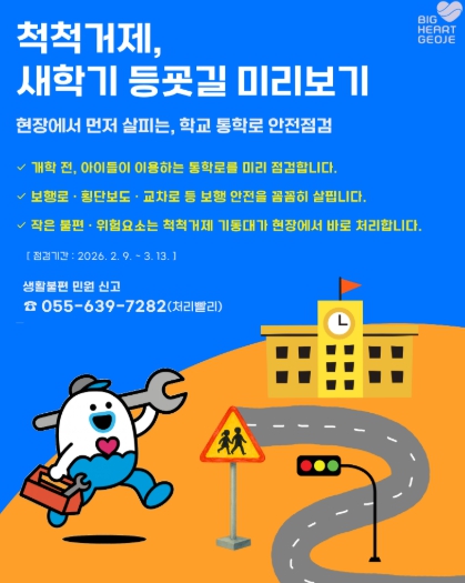 거제시장은 “새학기 개학을 앞두고 통학로를 중심으로 소관 도로·교통 시설물을 보다 촘촘하게 점검해, 아이들의 등굣길에서 발생할 수 있는 안전사고를 사전에 예방하고자 한다”며, “현장 중심의 점검과 신속한 대응 체계를 통해 시민 모두가 안심할 수 있는 생활 안전 확보에 최선을 다하겠다”고 말했다.