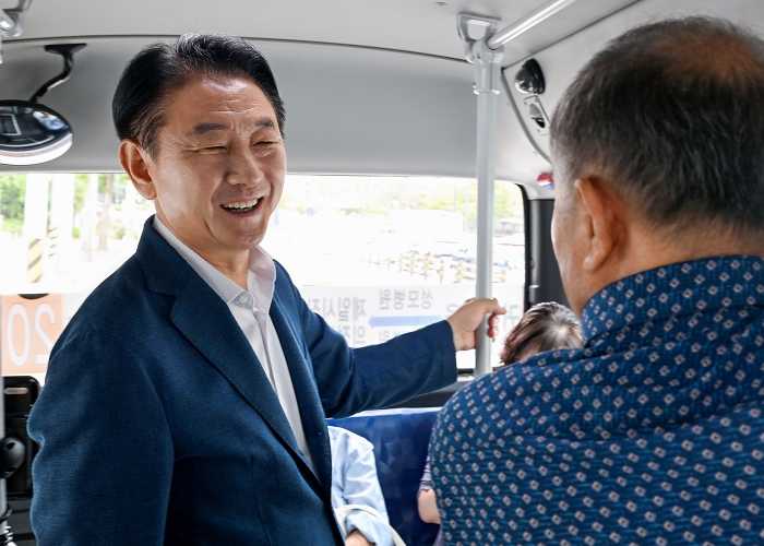 ▲ 김동근 시장이 9월 9일 자일동 현장 점검을 위해 마을버스 207-1번을 타고 주민과 소통하고 있다. |
