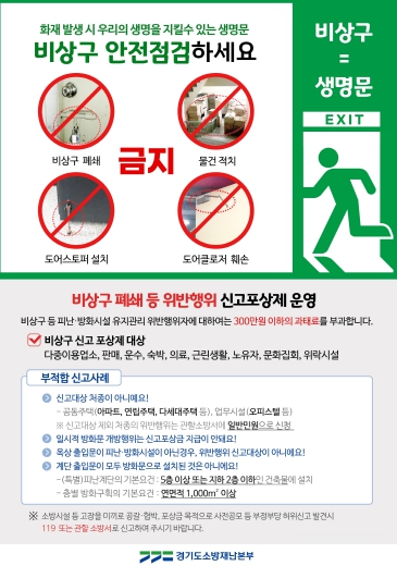 [뉴스노크=김인호 기자] 광명소방서는 비상구 폐쇄 등 피난·방화시설 유지관리 위반행위에 대해 시민의 자발적 신고를 활성화하기 위한 ‘신고포상제’를 강도 높게 운영하고 있다고 5일 밝혔다.