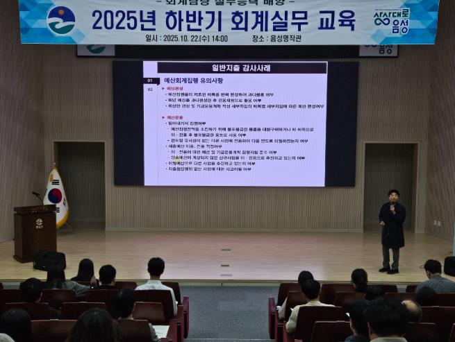 [뉴스노크=김인호 기자] 음성군은 22일 음성명작관에서 회계 담당 군 공직자 130여 명을 대상으로 ‘2025년 하반기 회계실무 교육’을 실시했다.