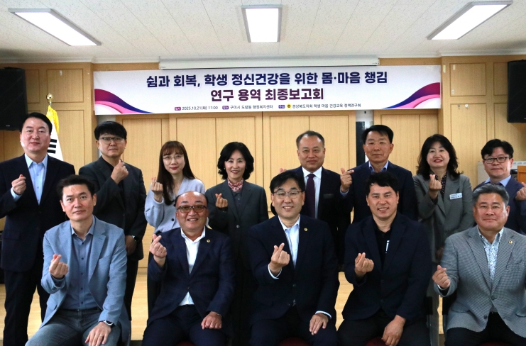 한편,'경상북도 학생 마음 건강교육 정책연구회'는 황두영 대표의원을 비롯해 권광택, 김경숙, 김창혁, 김홍구, 윤종호, 임병하, 차주식, 최병근 의원 등 9명으로 구성되어 있다. 연구회는 지난 8월부터 약 3개월간 연구활동을 이어왔으며, 이번 최종보고회를 끝으로 연구용역을 마무리하고 향후 조례 제·개정과 정책 대안 마련 등 실질적인 의정활동에 적극 반영할 계획이다.