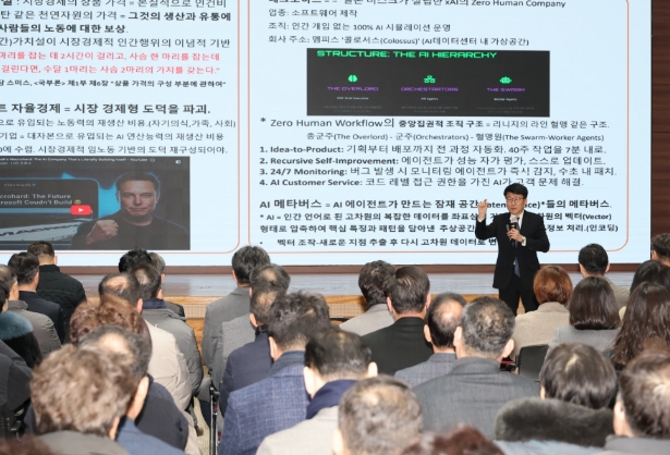 이날 강의에서는 AI 에이전트 자율경제 시대의 도래를 중심으로, 메타버스와 결합된 새로운 경제 질서의 변화 가능성을 설명하며, AI 기술이 산업 전반의 생산성과 경쟁력을 재편하고 있음을 강조했다.