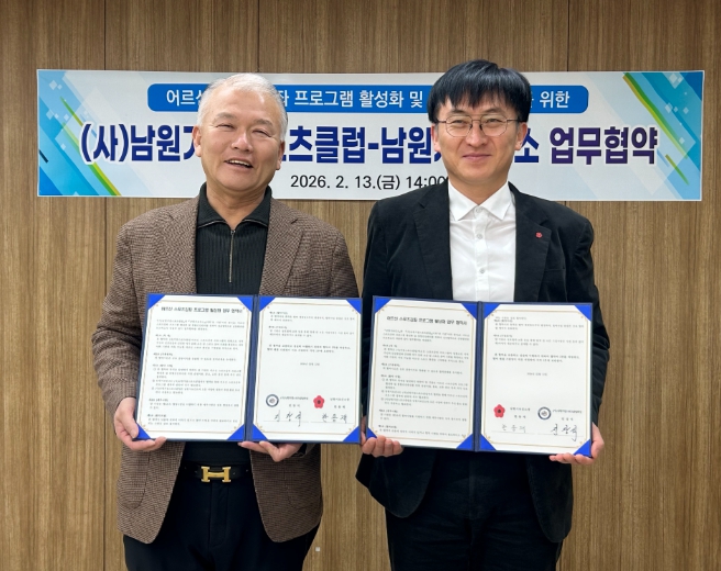 [뉴스노크=김인호 기자] 남원시보건소는 2월 13일 (사)남원거점스포츠클럽과 함께 지역 어르신들의 스포츠 참여 기회를 확대하고 통합적인 건강관리 서비스를 제공하기 위한 업무협약(MOU)를 체결했다.