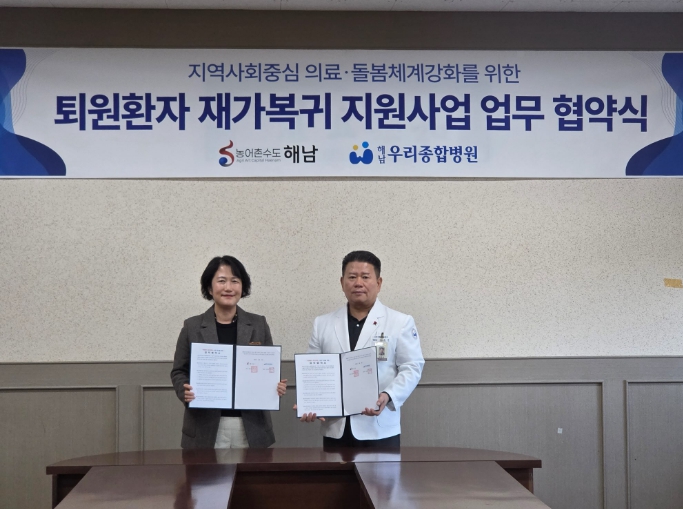 해남군과 해남종합병원(원장 김동국), 해남우리종합병원(원장 김옥민)은 지난 6일‘퇴원 환자 재가 복귀 지원을 위한 업무 협약’을 체결했다. 이번 협약은 전문 의료 사회복지사가 상주하는 지역 의료기관과 협력해 퇴원 직후 발생할 수 있는‘돌봄 공백’을 메우기 위해 마련됐다.