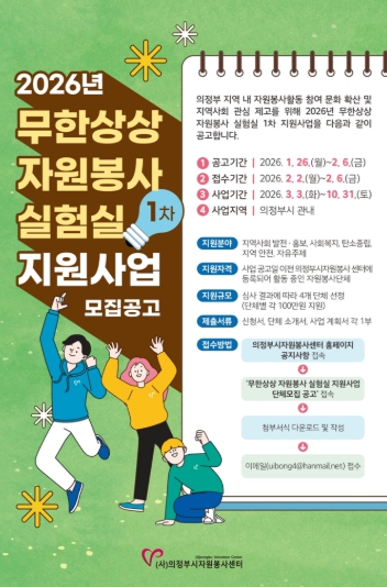 [뉴스노크=김인호 기자] 의정부시자원봉사센터는 관내 자원봉사 참여 문화 확산과 지역사회 문제 해결을 위한 '2026년 무한상상 자원봉사 실험실' 1차 지원사업 공모를 진행한다.